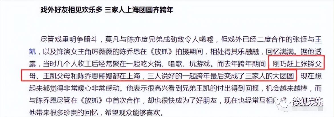 至于为啥陈乔恩爸妈和王凯爸妈熟络,是因为王凯和陈乔恩合作过《放弃我,抓紧我》,这部剧几位主演的父母都互相认识,都关系好。2016年新年期间,包括王凯、陈乔恩以及演员张铎,三家就一起欢聚庆祝。