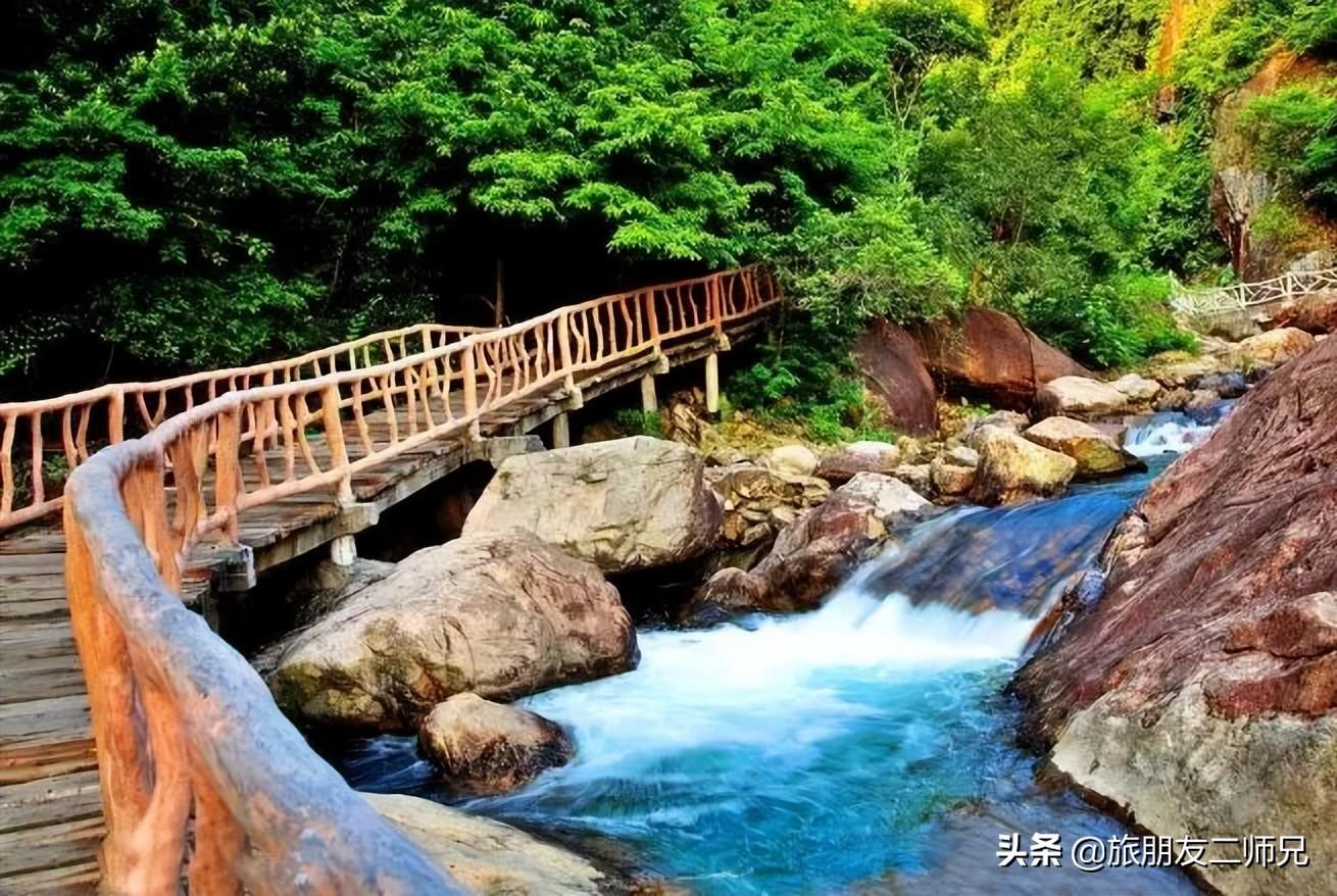 亲水栈道贴着溪流,指向山谷深处,沿着木栈道一路上山,这也是天梯的一部分。