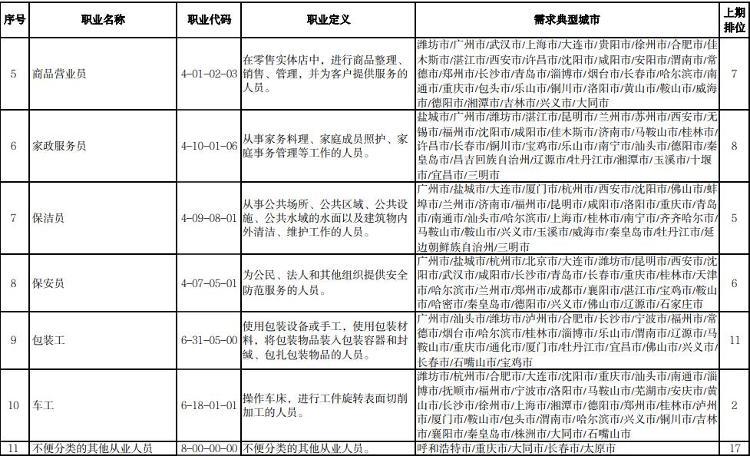 18日,人力资源和社会保障部发布2022年第四季度“最缺工”的100个职业排行。根据排行显示,营销员、汽车生产线操作工、快递员、餐厅服务员、商品营业员、家政服务员、保洁员、保安员、包装工、车工位列前十。