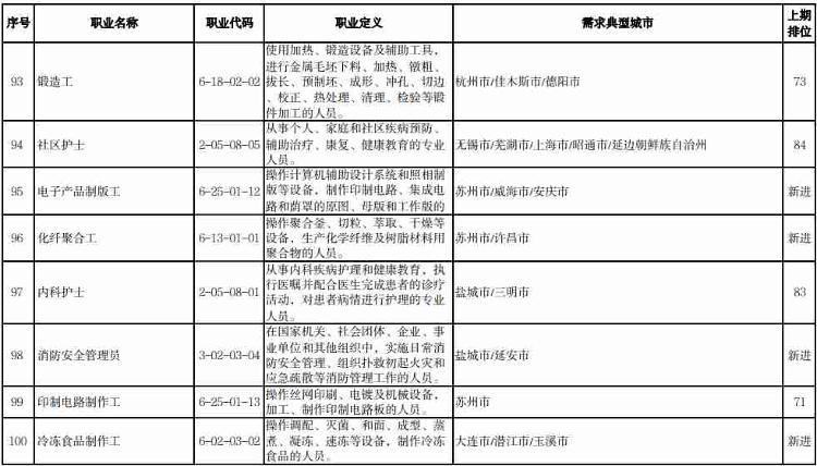 人社部介绍,本期数据构成据由“序号”“职业名称”“职业代码”“职业定义”“需求典型城市”“上期排位”六个部分组成。“职业名称”“职业代码”“职业定义”适用中华人民共和国职业分类大典的职业分类标准。“需求典型城市”是指填报该职业需求的典型城市名单,排在前面的城市需求缺口大于排在后面的城市。“上期排位”表示上期(2022年第三季度)该职业的排位情况。