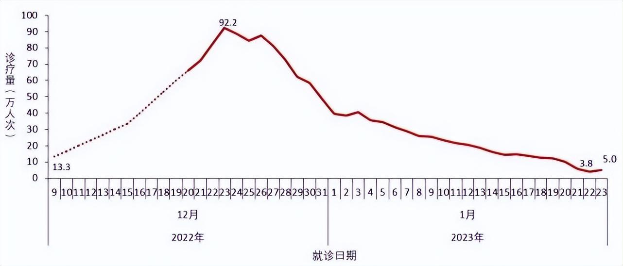 全国(不含港澳台)发热门诊(诊室)就诊人数于2022年12月23日达到峰值286.7万人次,随后连续下降,2023年1月23日下降到6.3万人次,较峰值下降了97.8%(图2-1)。